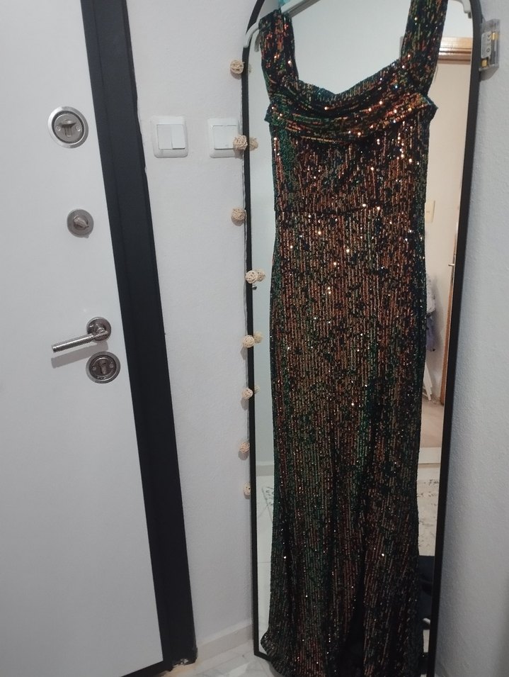 Dar kesim, straplez uzun abiye elbise, drapeli tasarımı ve çok renkli yılan desenine sahiptir. Kolsuz ve bohem tarzıyla partiler için uygundur.