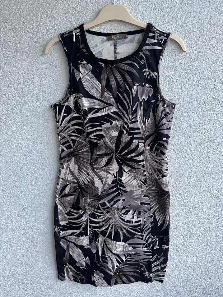 Gri desenli, drapeli detaylara sahip kolsuz, vücuda oturan mini elbise. Yumuşak sentetik kumaştan, günlük kullanım için uygun.