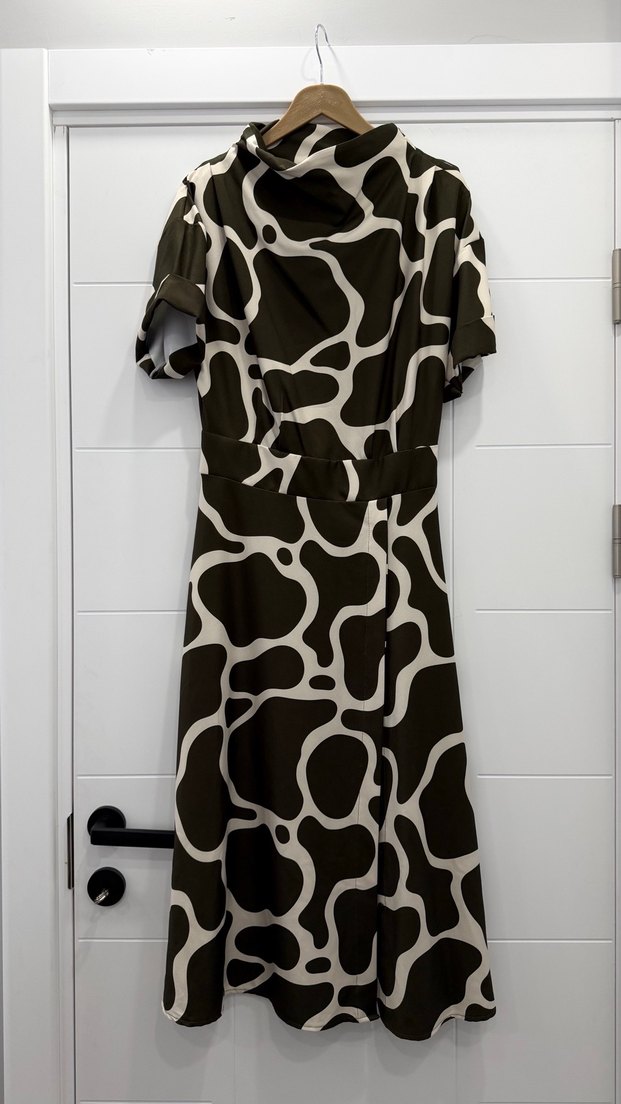Uzun, kahverengi ve gri desenli elbise, bol kesim, drapeli detaylar ve yüksek yakaya sahiptir. Kısa kolludur, sentetik kumaştan yapılmıştır ve günlük kullanıma uygundur.