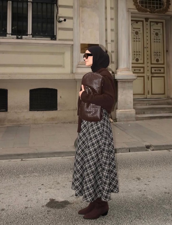 , triko uzun etek; bol kesim, drapeli ve koyu ekose desenlidir. Sokak stili ve günlük kullanıma uygundur. Belden fermuarlı