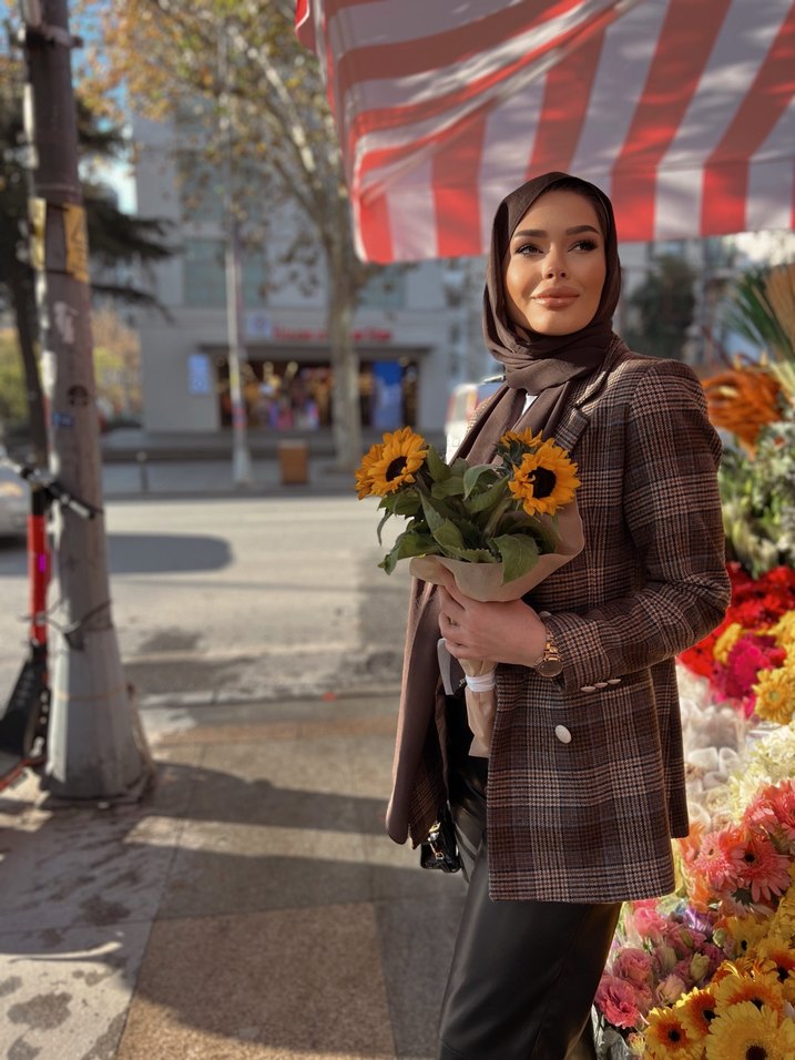 Kahverengi etnik desenli kadın takımı, drapeli ve uzun kolludur. Normal kesim ve midi boyda, sentetik kumaştan üretilmiştir. Günlük sokak stiline uygundur.