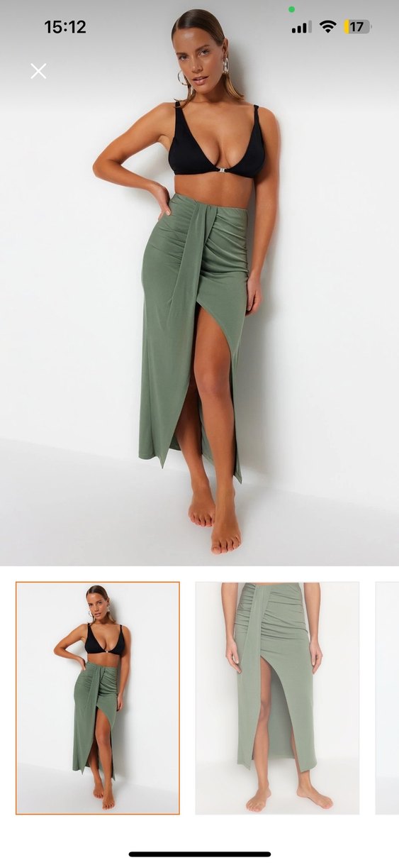 Drapeli ve yırtmaçlı, uzun ve fit kesim haki renkte etek. Günlük kullanım için yumuşak sentetik kumaştan.