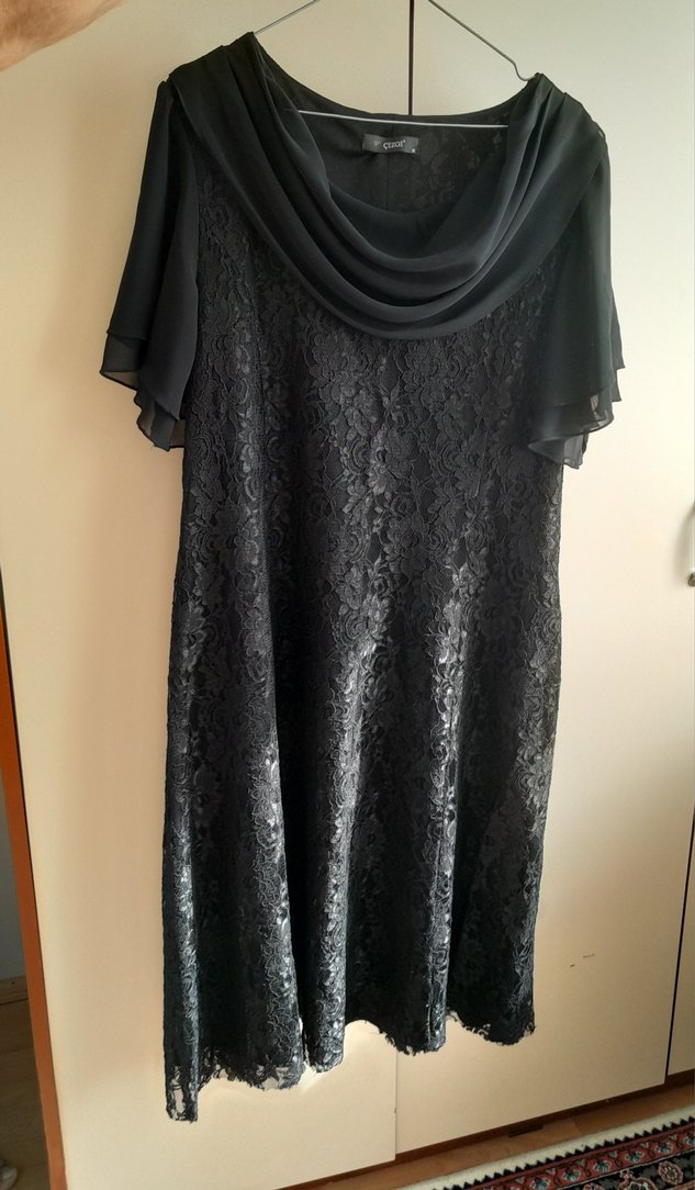 Siyah elbise, drapeli yaka ve kısa kollu. Gevşek kesim, desenli dantel detaylı, hiçbir sıkıntısı yok