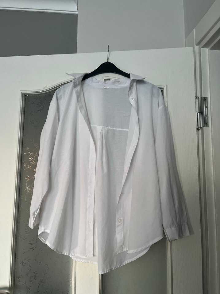 Kadınlar için keten kumaştan, drapeli ve midi boyda, uzun kollu, yakalı, bol kesim gri beyaz gömlek. Minimalist sokak stiline uygun, günlük kullanım için idealdir.