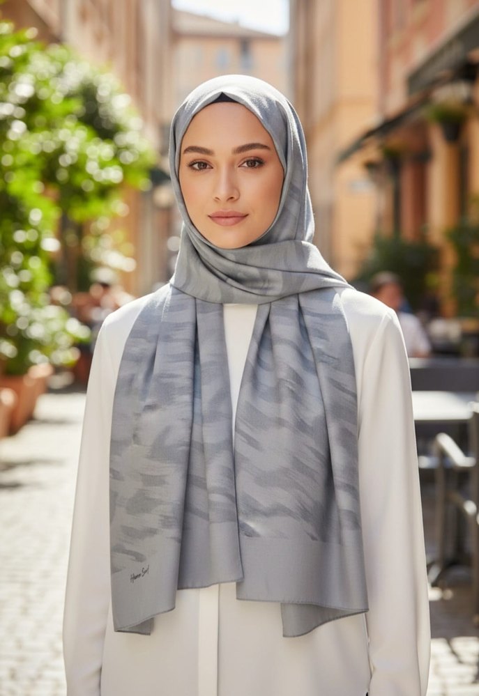 Drapeli tasarıma sahip gri kadın şal, , mütevazı sokak stili için uygun.