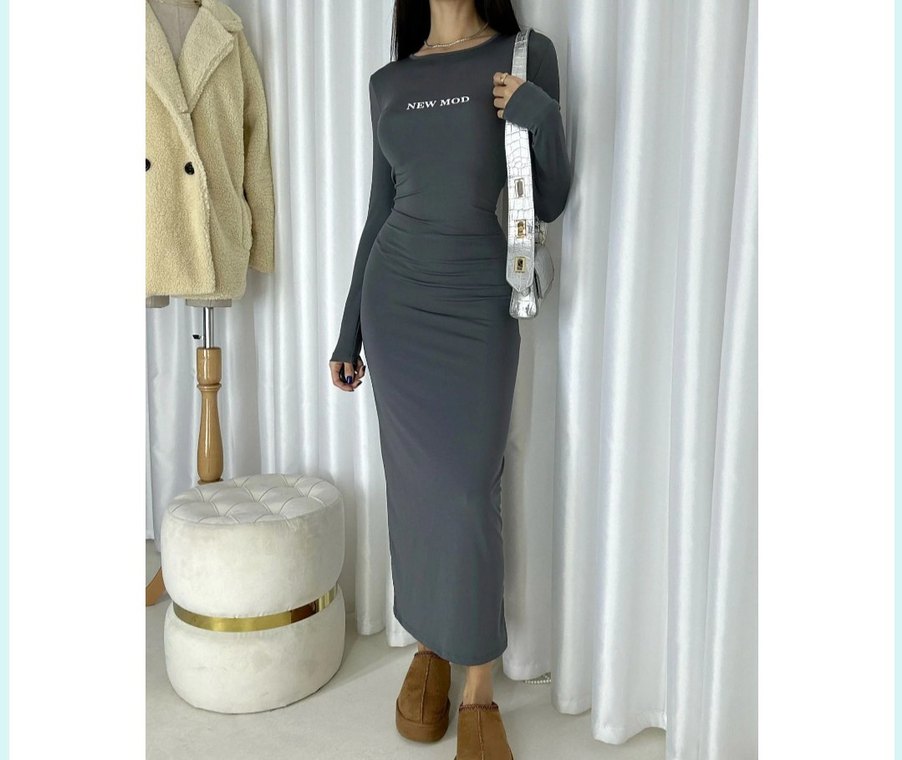 Vücuda oturan gri uzun elbise, uzun kollu ve yüksek yakalıdır. Drapeli detay ve "NEWMOD" baskısı bulunur. Günlük kullanıma uygundur.