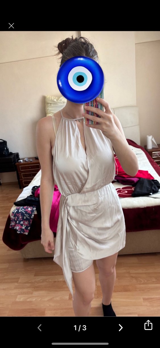 halter yaka ve drapeli detaylara sahip midi boyda, vücuda oturan şık bir elbise. İnce askıları ve çağdaş tasarımıyla parti için ideal.