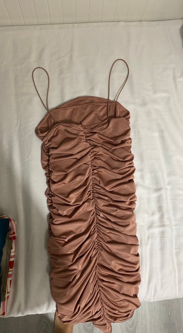 Drapeli, ince askılı, straplez yaka bej uzun elbise. Parlak kumaşı ve vücuda oturan kesimiyle parti için uygundur. ✨