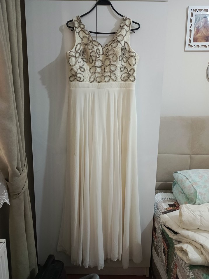 İnce işlemeli, drapeli beyaz uzun elbise, kolsuz ve salaş kesimli, tekne yaka tasarımıyla vintage düğünler için uygundur. Bir kere düğünümde giydim.