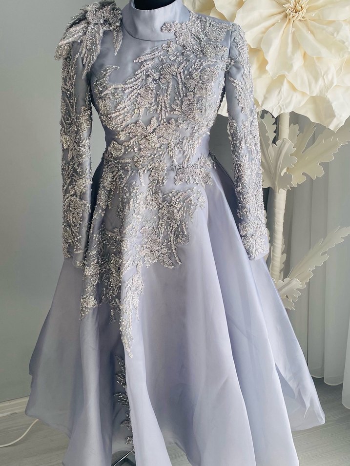 Şal dahildir day sorunuz Yüksek yakalı, uzun kollu gri elbise, işlemeli detaylar ve drapeli tasarımıyla modern klasik bir şıklık sunar.