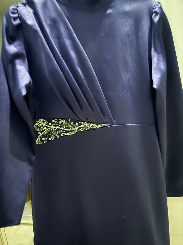 Mavi uzun abiye elbise, drapeli tasarım ve belde işlemeli detaylara sahiptir. Notlu yaka ve uzun kollu, düzenli kesimle sade ve modern bir görünüm sunar abiyedir özel günleriniz için