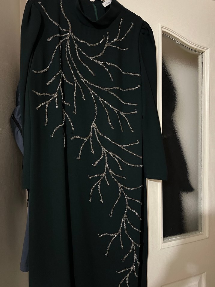 Yüksek yakalı, drapeli siluete ve dal desenli işlemelere sahip uzun kollu abiye. Sadece 3 saat giyildi temizdir 2.500 Tl’ye alındı 6 ay önce. İndirim payı yapılır