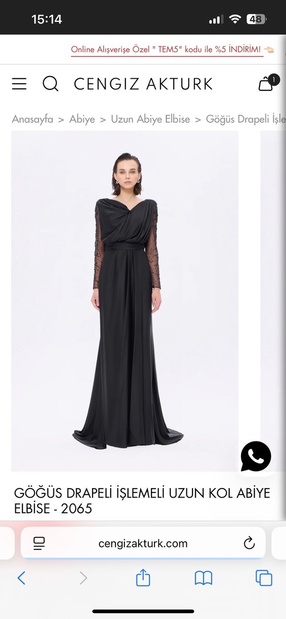 Siyah uzun kollu abiye elbise, drapeli V yakaya ve işlemeli tül kollara sahiptir. Salaş kesimi ve uzun boyuyla düğünler için uygun, gotik klasik şıklık sunar.