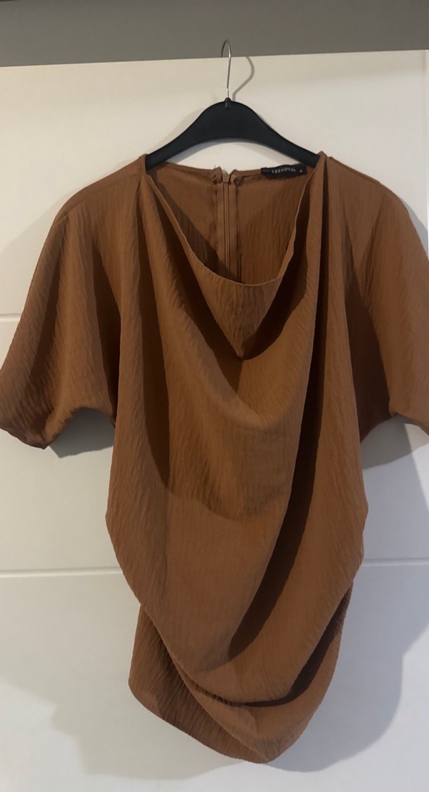 Kahve renkte, drapeli tekne yaka ve kısa kollu, bol kesim midi uzunlukta kadın bluz. Minimalist ve çağdaş tarz için uygundur.