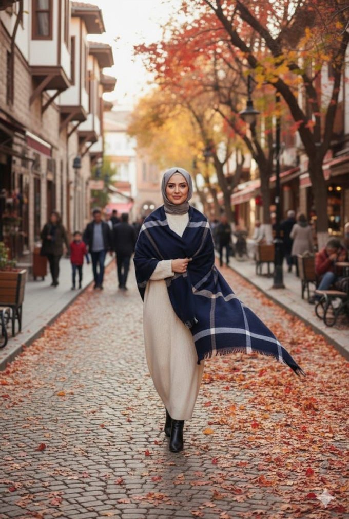 Kadınlar için drapeli tasarıma sahip, hafif camel renginde, yumuşak ve sıcak kumaştan yapılmış şal.