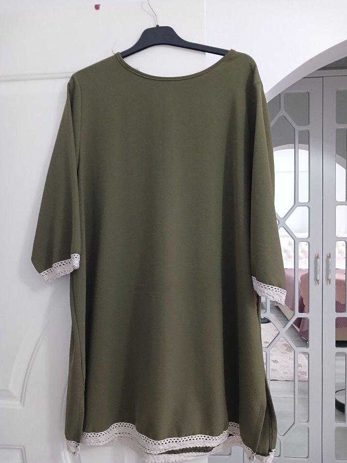 Kadınlar için drapeli, bol kesim, bisiklet yaka ve kısa kollu haki tunik. Sentetik kumaştan, düz ve desensiz, günlük kullanıma uygun minimal bohem tarzda.