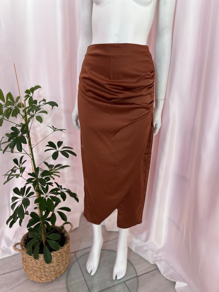 Drapeli detaylara sahip, uzun ve ince kesim kahverengi etek, ipeksi dokusuyla minimalist ve çağdaş bir stil sunar.
