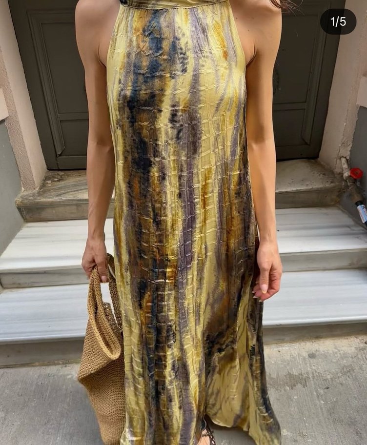 Askısız, kolsuz uzun elbise, parlak kahverengi bağlamalı desen ve drapeli tasarıma sahiptir. Bol kesim ve bohem stildedir, günlük kullanım için uygundur.