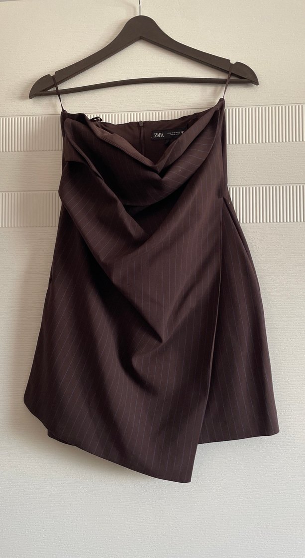 Kahverengi, çizgili ve drapeli tasarıma ofis için çağdaş ve rahat kısa elbise