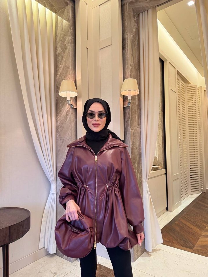 Kahverengi deri midi yağmurluk, drapeli tasarımı, bol kesimi, yüksek yakası ve uzun kollarıyla günlük sokak stiline uygundur. Desensiz ve koyu renklidir. ☔