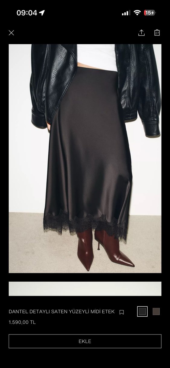 Kahverengi deri uzun etek, drapeli detaylar ve dantel uçlu, bol kesimiyle gotik ve Paris tarzını ofis şıklığıyla buluşturur.