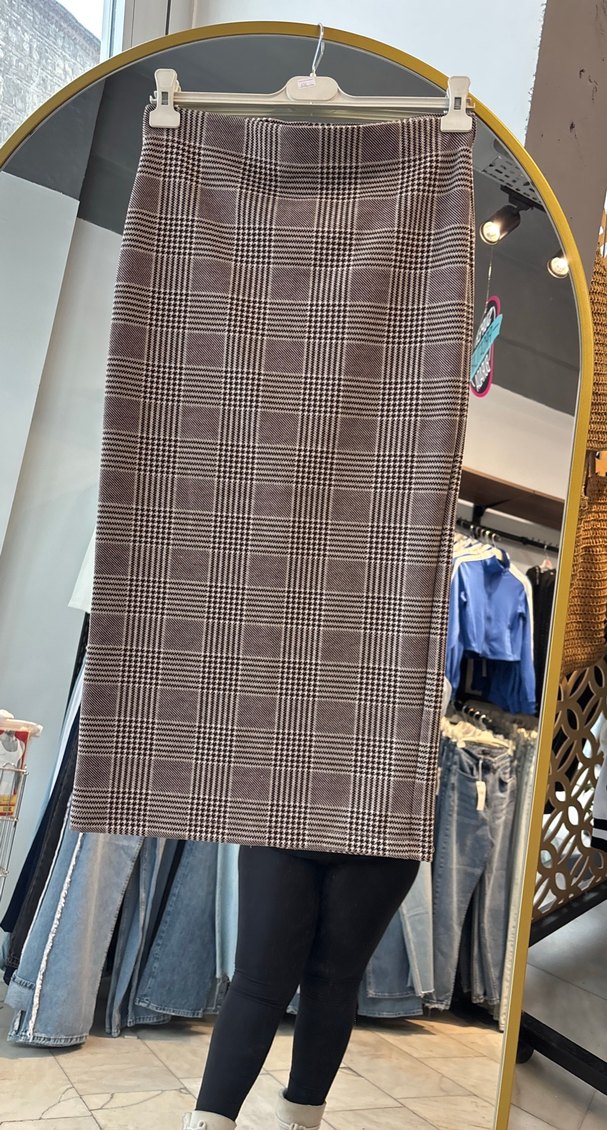 Kahverengi ekose desenli, drapeli tasarıma sahip, sentetik kumaştan yapılmış normal kesim hamile midi etek. Günlük ve sokak stili için uygundur.