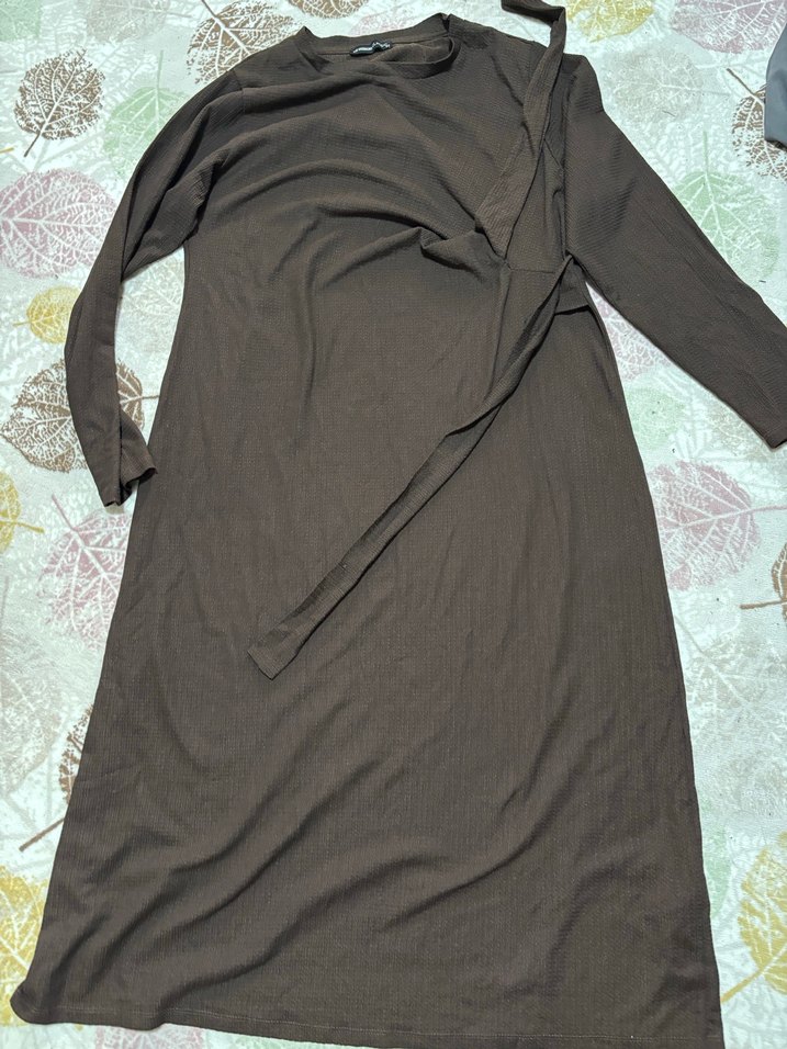 Drapeli detaylara sahip, kahverengi uzun elbise. Uzun kollu, boğazlı ve salaş kesimle günlük rahatlık sunar. Sentetik kumaştan üretilmiştir.
