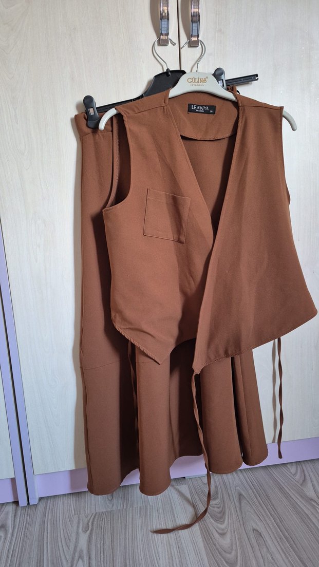 Kahverengi, kolsuz kadın takımı, drapeli tasarıma ve kesikli yaka detayına sahiptir. Uzun ve regular fit kesim, yumuşak sentetik kumaştan üretilmiştir.