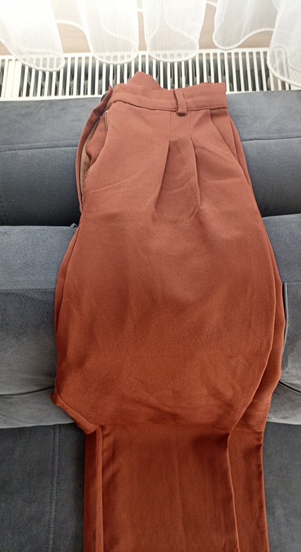 Kahverengi kumaş kumaştan, drapeli, normal boy midi kadın pantolon. Rahat kesimi ve desensiz yapısıyla ofis ve günlük kullanıma uygundur. boyu 1.10 bı kaç yerde ip kaçmış maa çok belli olmuyor tiftiklenme yok