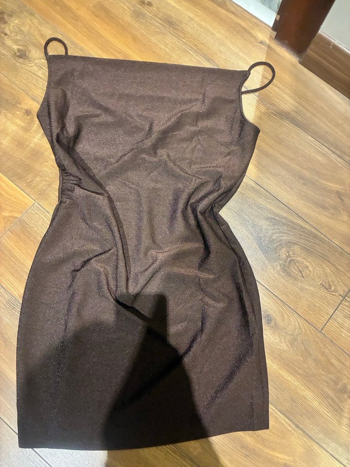 Bu kahverengi, drapeli midi abiye elbise, tekne yaka ve ince askılı kollara sahip, romantik akşamlar için ideal.