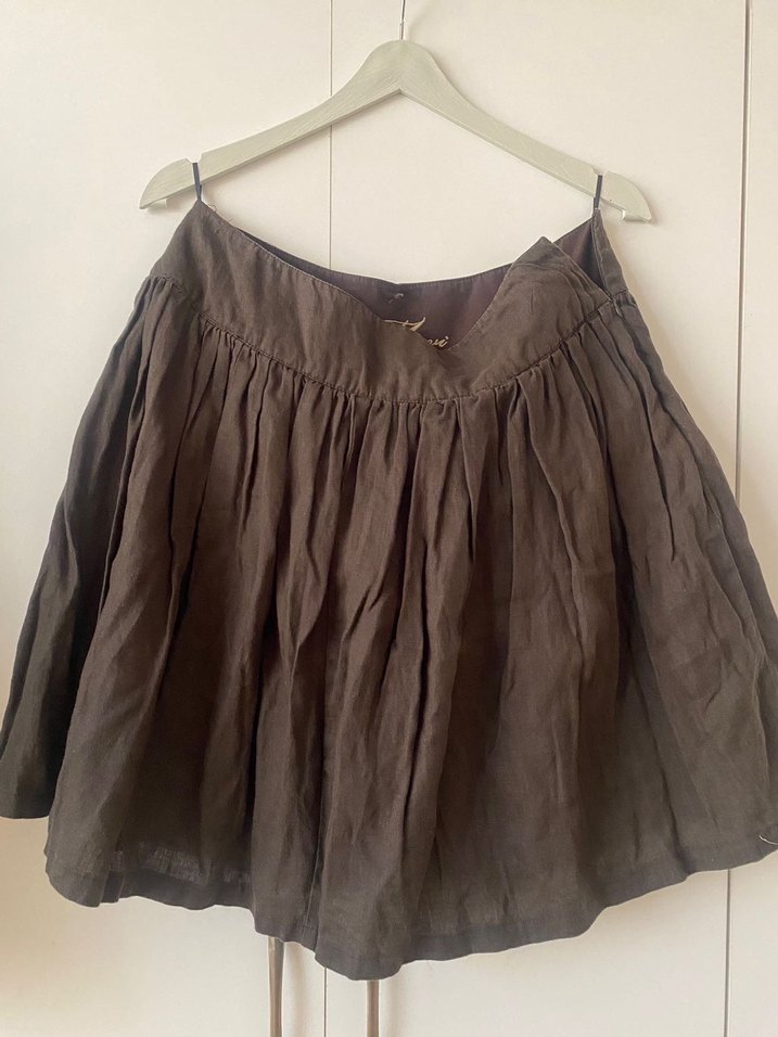 Kahverengi keten hamile eteği, drapeli ve bol kesim, midi boyda, bohem vintage tarzıyla günlük kullanım için uygun.