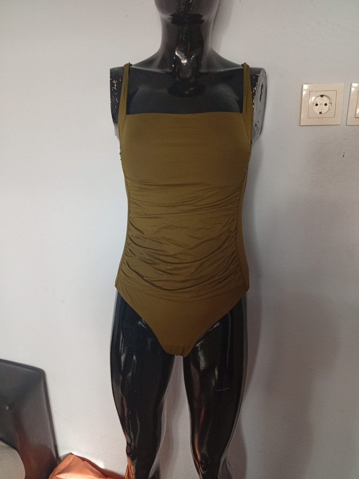 Bu kahverengi mayo, ince askıları ve drapeli tasarımıyla çağdaş avant-garde tarzını midi boyda sunar. Günlük kullanıma uygundur.