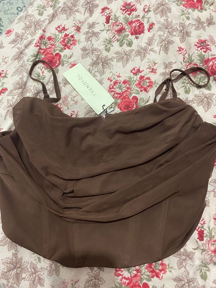 Kahverengi, drapeli ve ince askılı straplez bustiyer. Yumuşak sentetik kumaştan, bohem tarz için uygun, romantik akşamlar için ideal.