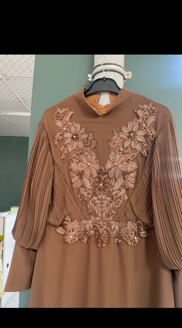 Elbise 46 beden fakat 44 bedene daha iyi olur. Drapeli, yüksek yakalı ve pilili uzun kollu kahverengi abiye elbise. Nakışlı çiçek desenleriyle vintage ve bohem tarzda, klasik şıklık sunar.