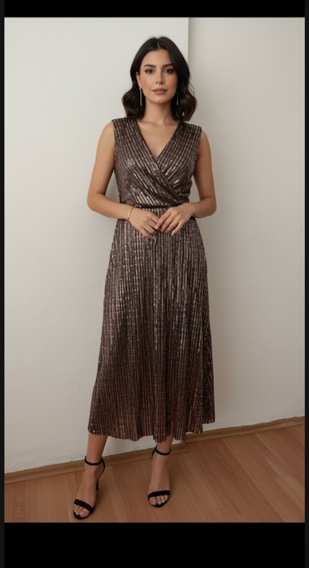Kahverengi parlak yılan desenli, drapeli kolsuz uzun elbise. V yaka ve regular fit, yumuşak sentetik kumaştan. Romantik akşamlar için uygun marka temsildir.