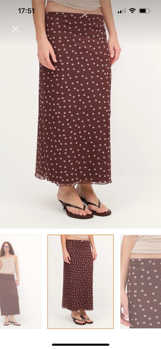 Kahverengi puantiyeli, drapeli ve bol kesim midi hamile eteği, günlük kullanım için uygundur. L beden Hiç kullanılmadı