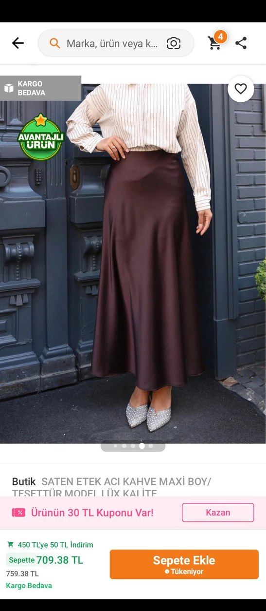 Uzun, bol kesim kahverengi saten etek, drapeli tasarımıyla klasik ve sokak stiline uygundur. Günlük kullanıma uygundur. ✨