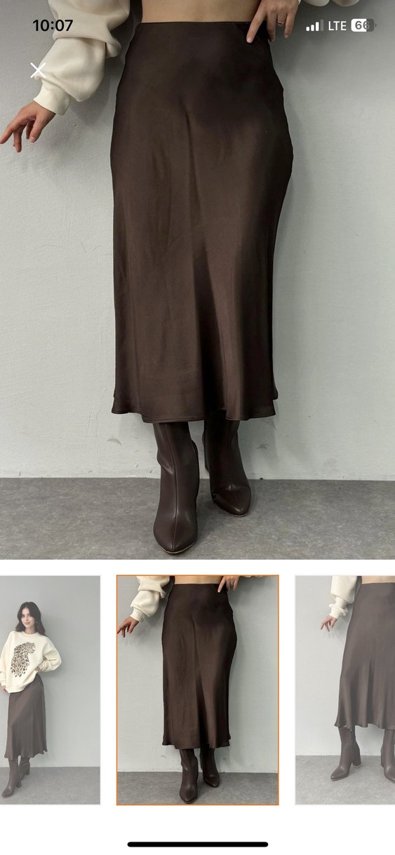 M beden Bu koyu kahverengi uzun saten etek, drapeli detayları ve bol kesimiyle çağdaş ve minimalist bir stil sunar, günlük kullanıma uygundur.