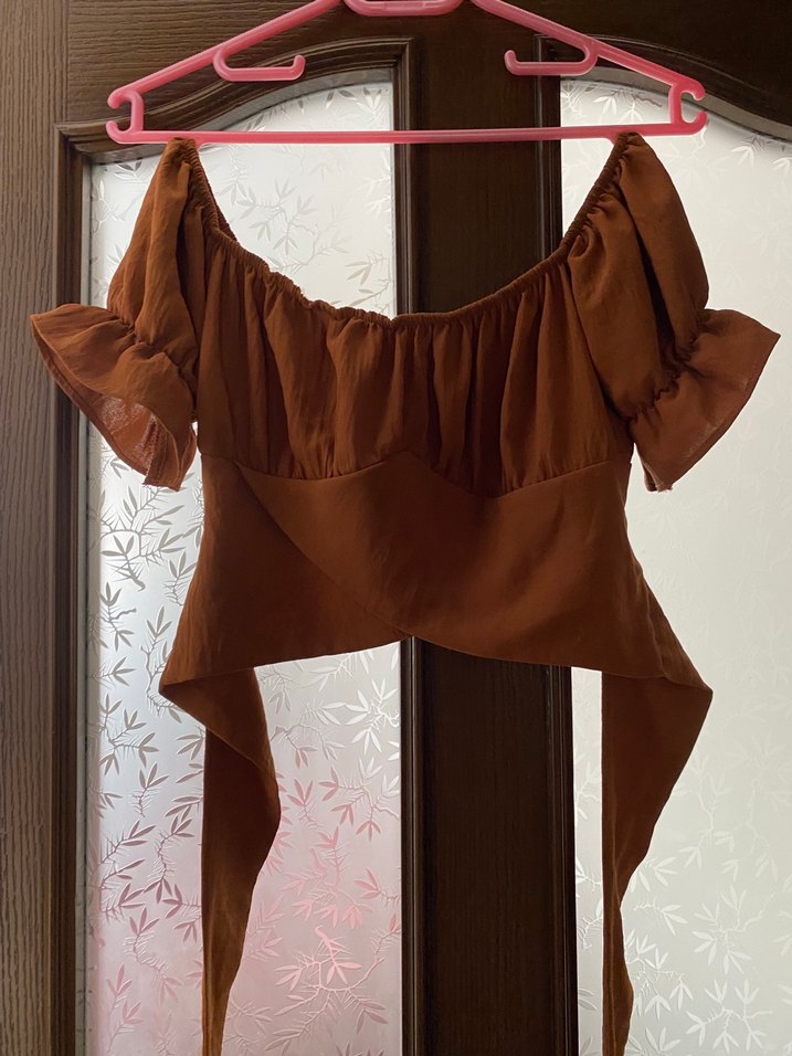 Kahverengi süet kumaştan, straplez yakalı ve drapeli detaylı bol kesim bluz. Askılı kolları ve bohem tarzıyla günlük kullanıma uygun.