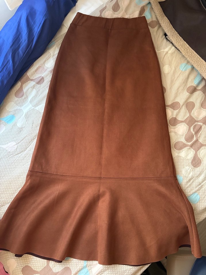 Parlak kahverengi süetten yapılmış, drapeli ve bohem tarzda, vücuda oturan uzun etek, günlük kullanıma uygundur.