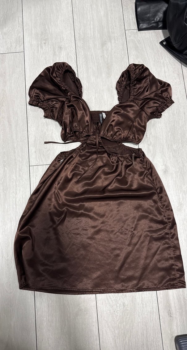 Drapeli detaylara sahip, V yakalı ve askılı kolları olan kahverengi uzun abiye elbisedir. Vintage gotik tarzıyla romantik akşamlar için şık bir tercihtir. ✨