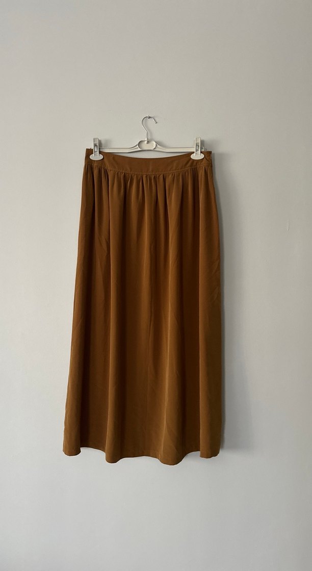 Kahverengi uzun etek, drapeli tasarımı, bol kesimi ve ipeksi dokusuyla minimal ve bohem tarzda. Hiç giyemedim cok büyük beden almışım kendime göre
