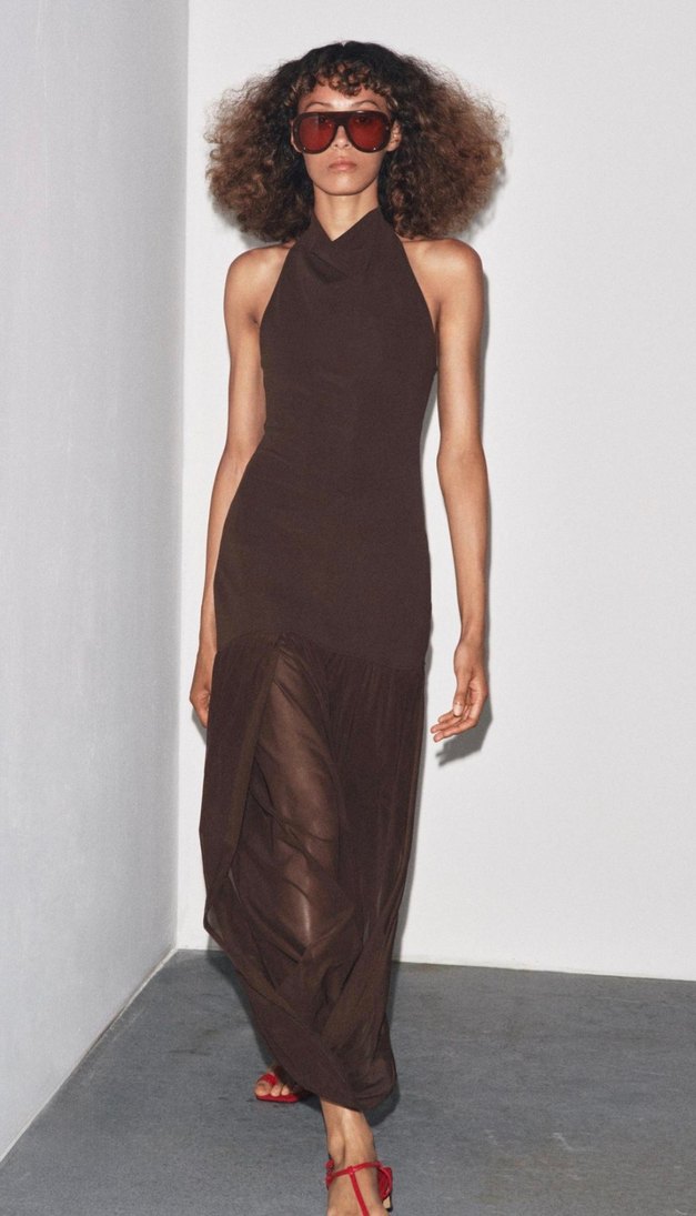 Drapeli, yüksek yakalı, kolsuz, kahverengi uzun elbise, ince kesimi ve ipeksi dokusuyla romantik akşamlar için uygundur.