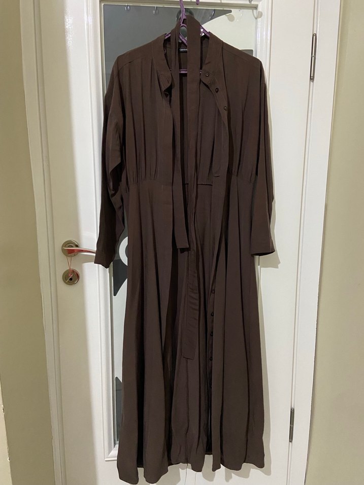Kahverengi gömlek elbise belden oturtmalı kuşaklı boyu 1.38 cm deformesi yok az kullanıldı.