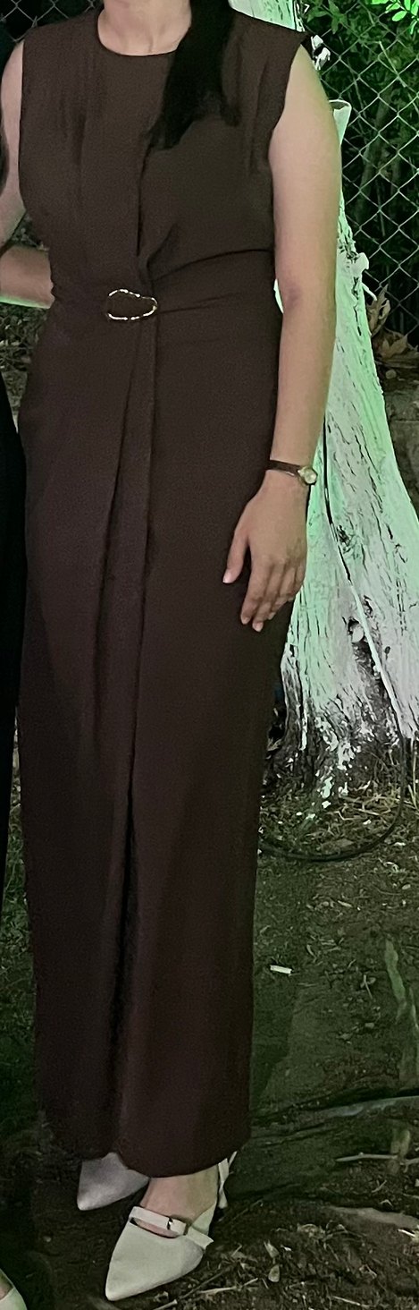 Kahverengi, drapeli, uzun ve kolsuz kadın elbisesi, notlu yaka detayına sahiptir. İpeksi kumaştan, rahat kesimli, minimalist ve sokak modası tarzında, düğün için uygundur.