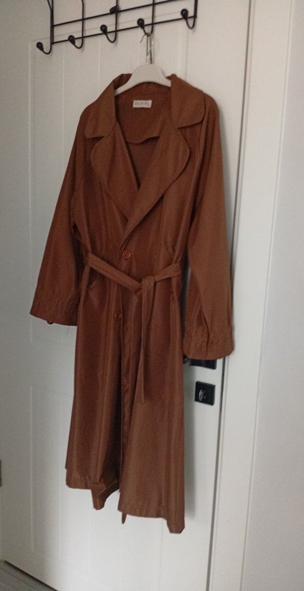 Drapeli, bol kesim kahverengi uzun trençkot. İpek gibi yumuşak dokulu, yakası kesik ve uzun kolludur. Günlük kullanım için uygundur.