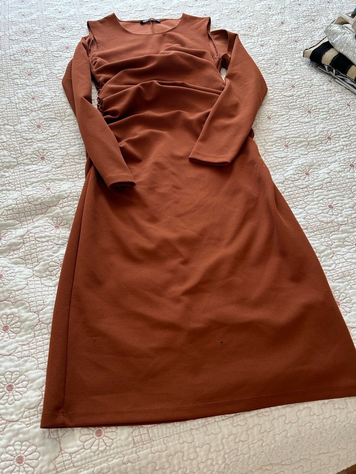 Yumuşak keten kumaştan, uzun kollu ve kayık yakalı, drapeli, kahverengi, vücuda oturan uzun elbise