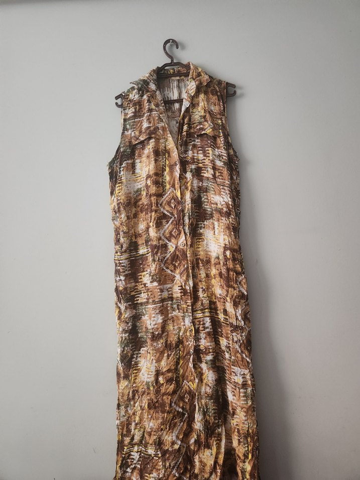 Kahverengi, kolsuz uzun elbise, drapeli tasarımı, yakalı ve bol kesimi ile dikkat çeker. Keten kumaştan yapılmış, koyu renkli batik deseni taşır.