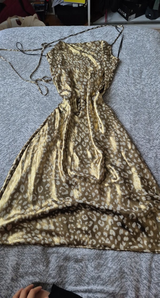 Parlak kahverengi desenli saten kumaştan, drapeli ve ince askılı, tekne yaka uzun, fit kesim elbise.