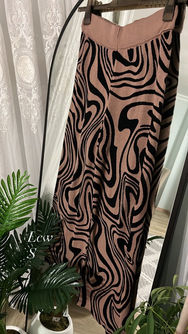 Kahverengi zebra desenli, bol kesim ve drapeli uzun pantolon. Yumuşak sentetik kumaştan, rahat ve çağdaş tarz için uygundur.